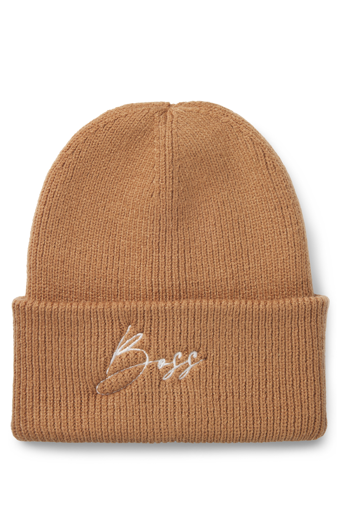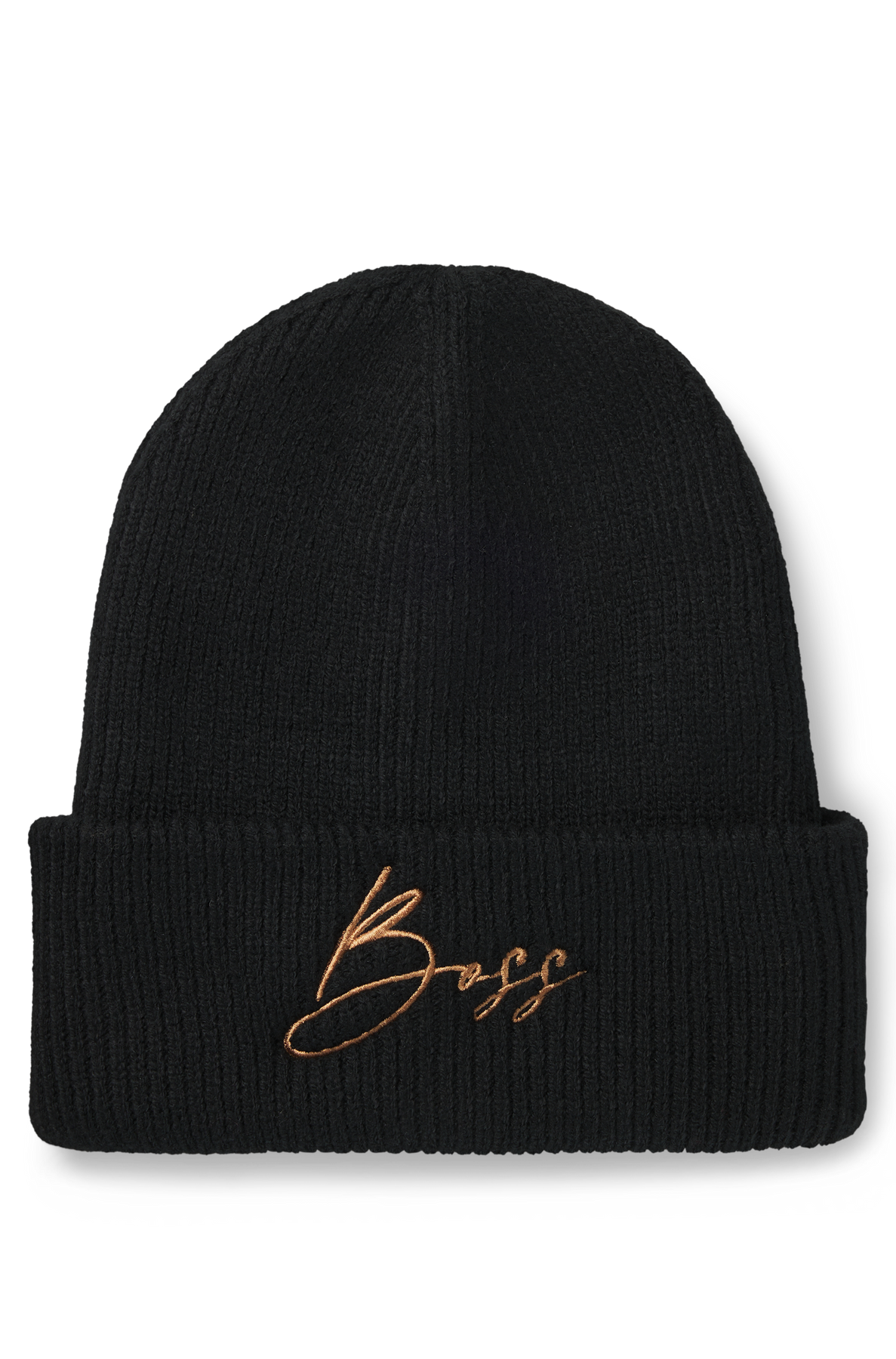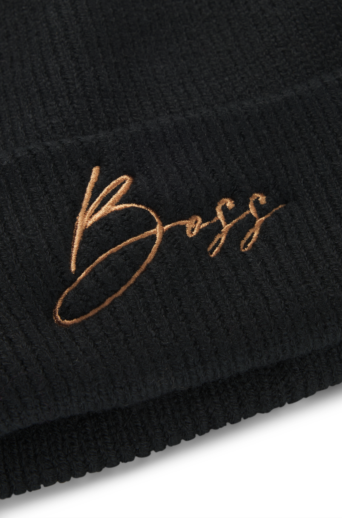 Kuschelige BOSS Mütze. Der Style in Rippenstrick ist aus 100 % recycletem Polyester und hat ein grosser Handschrift Logo aufgestickt.