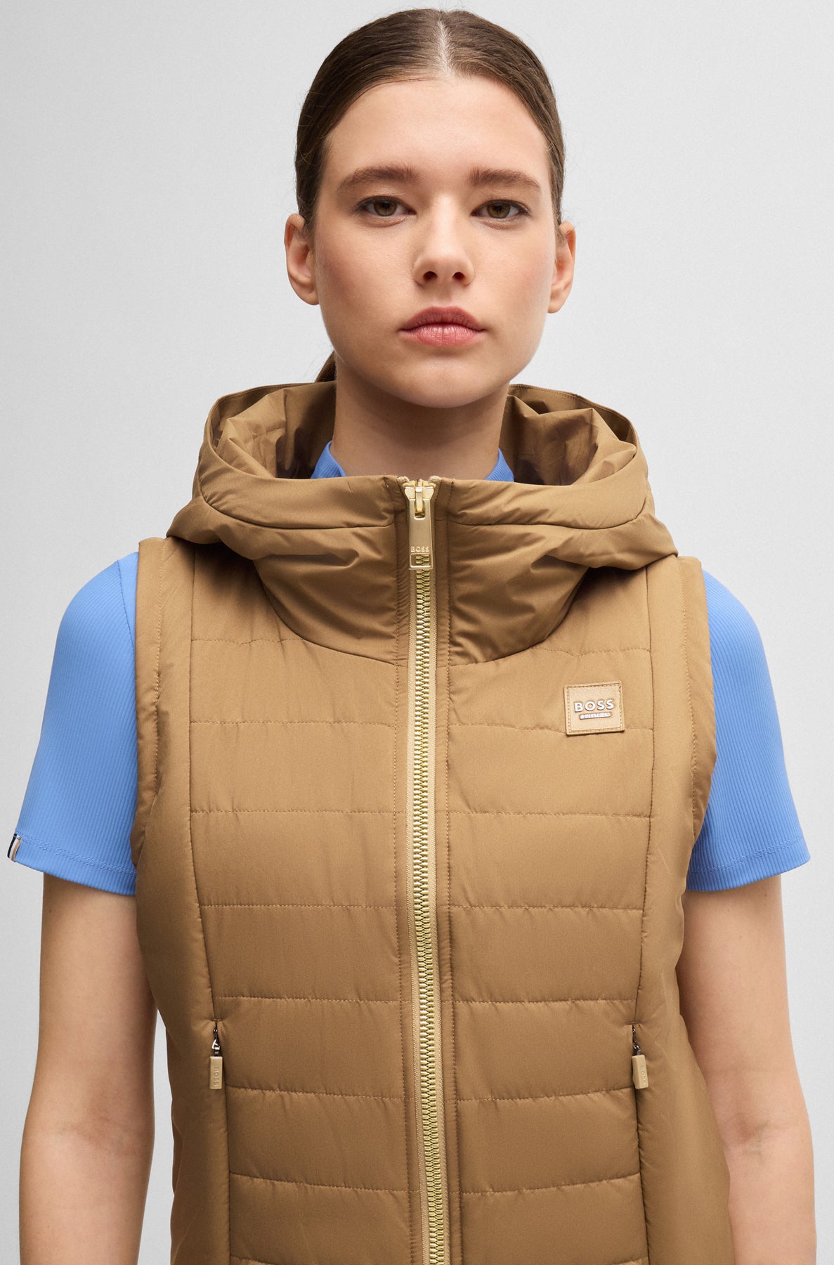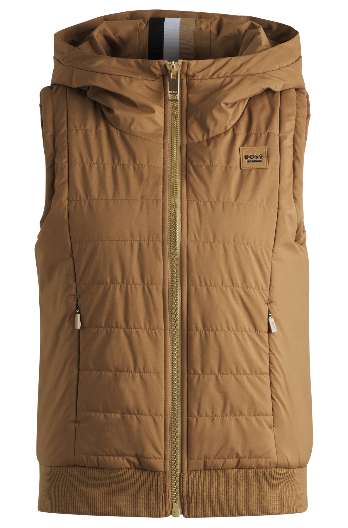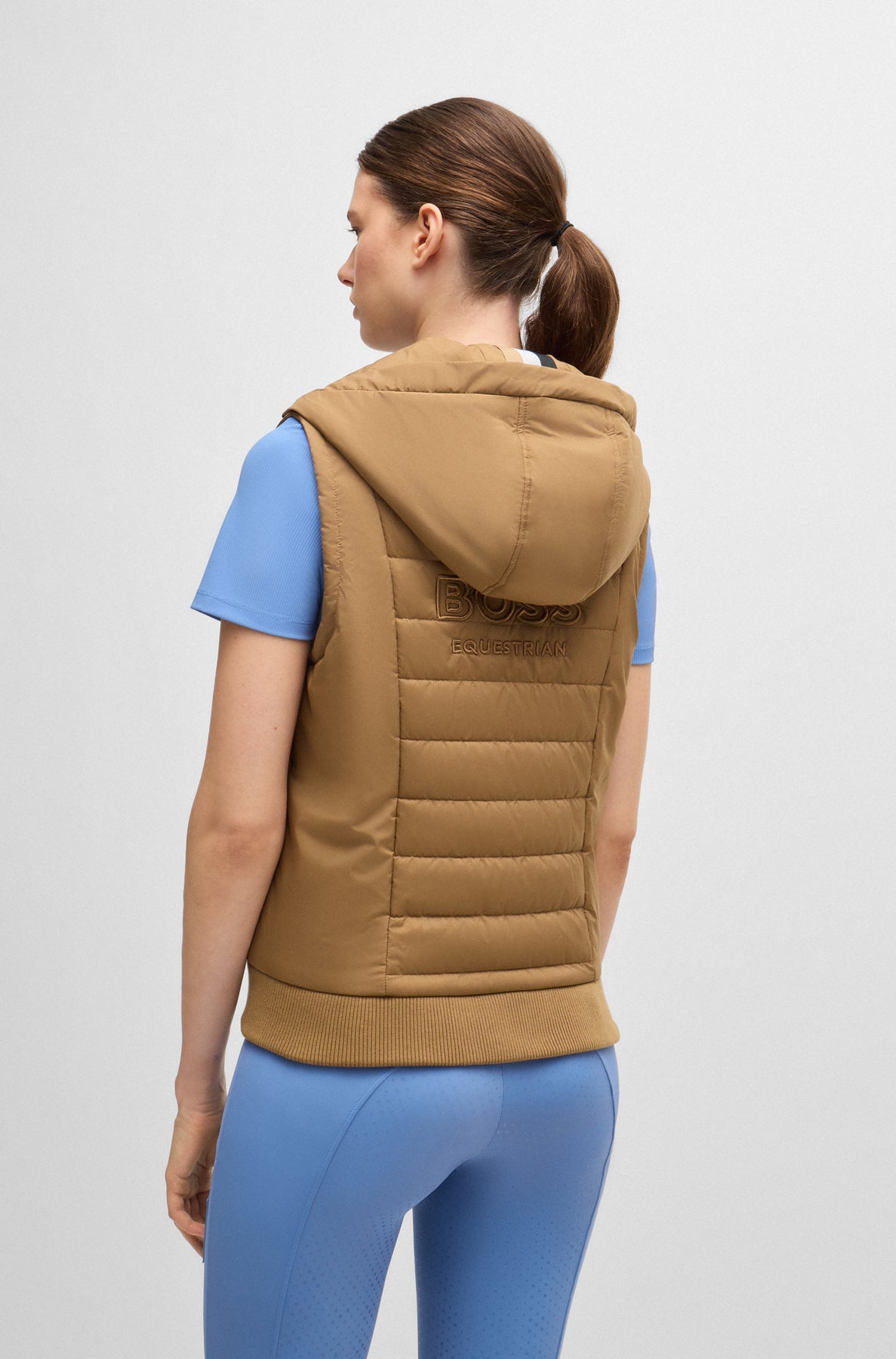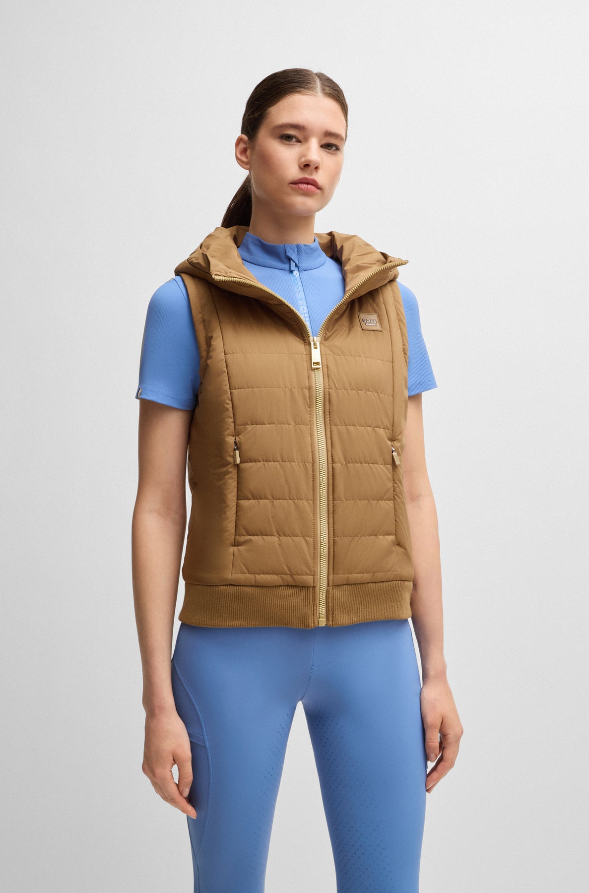 Weste mit Kapuze und Frontreißverschluss. Zwei Fronttaschen mit Reißverschluss und Strickbündchen am Saum. BOSS Equestrian Logo als Lederimitat-Patch auf der Brust und große Ton-in-Ton-Stickerei auf dem Rücken.