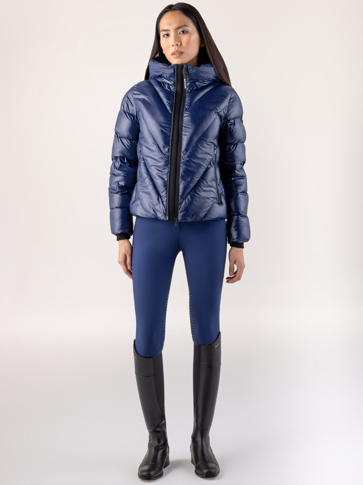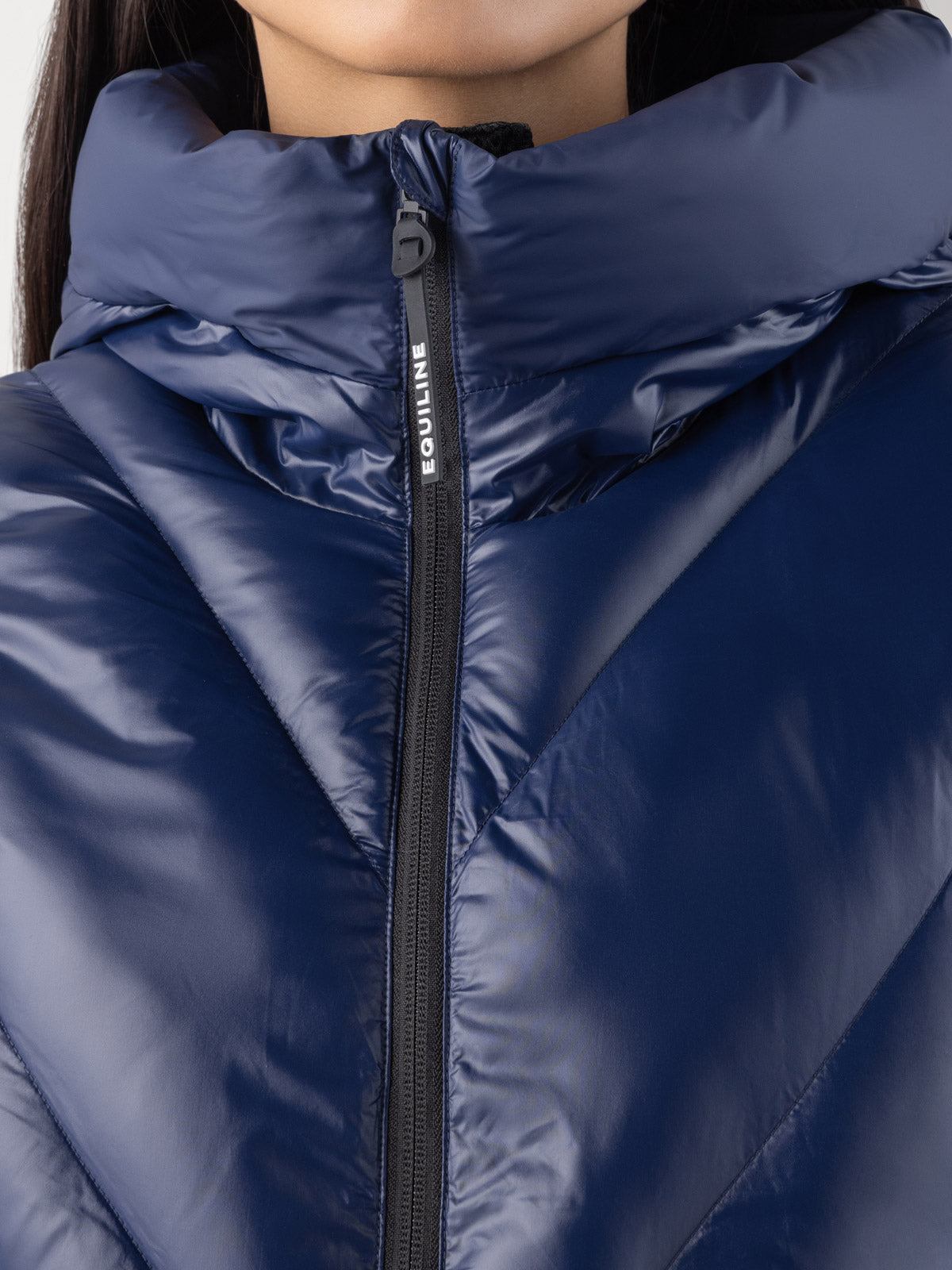 Die Eco-Duvet-Isolierung aus recycelten PET-Flaschen sorgt für nachhaltige Wärme, während die weichen Windstopp-Bündchen und der belüftete 3D-Mesh-Einsatz auf der Vorderseite den Komfort und die Atmungsaktivität erhöhen. Praktische Details wie ein Zwei-Wege-Frontreißverschluss, zwei Reißverschlusstaschen und ein Druckknopf zum Schließen der Kapuze sorgen für maximalen Komfort. Mit dem ikonischen Equiline logo auf der Kapuze kombiniert diese Jacke Funktionalität mit einem Hauch von moderner Eleganz.