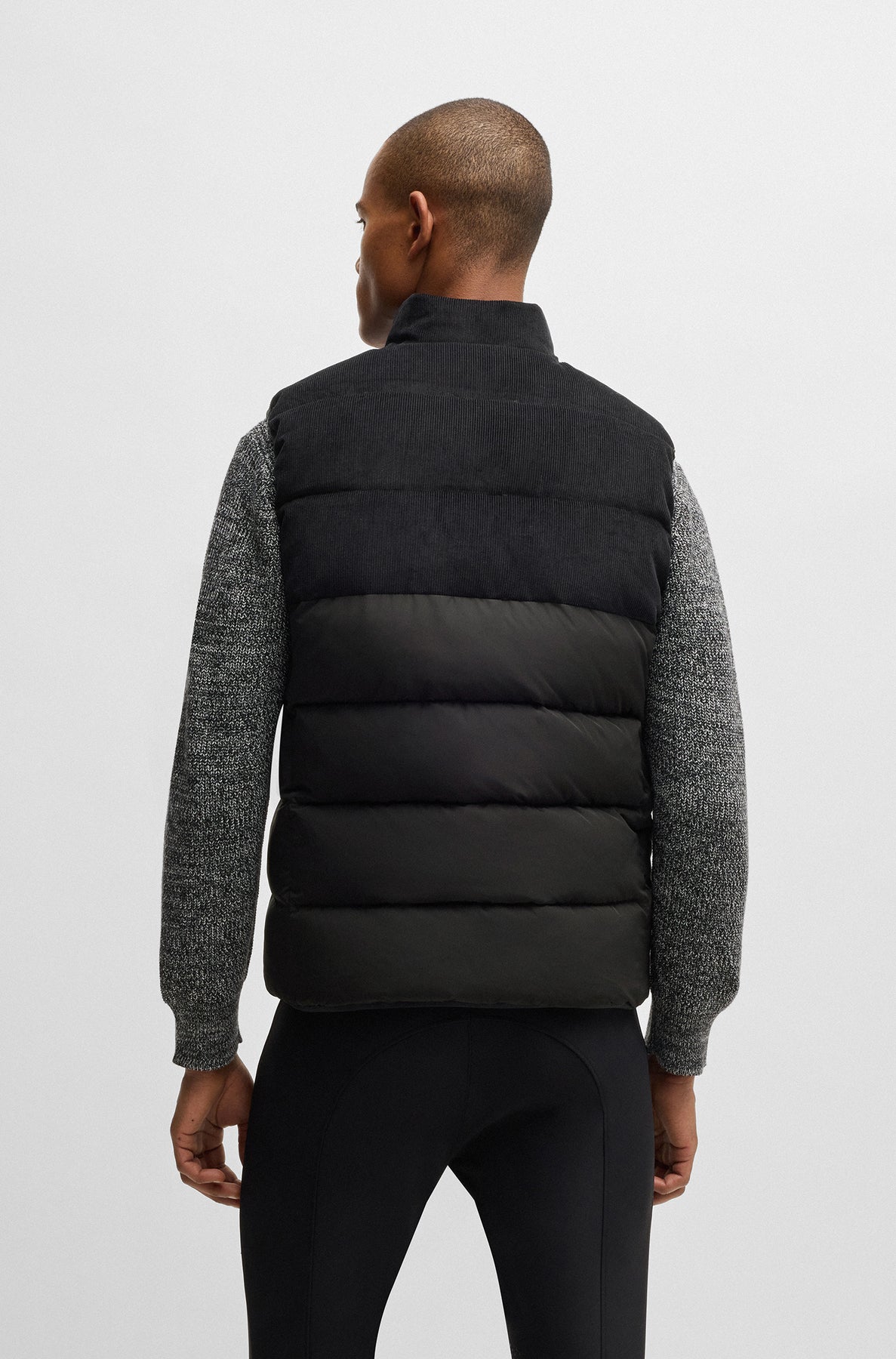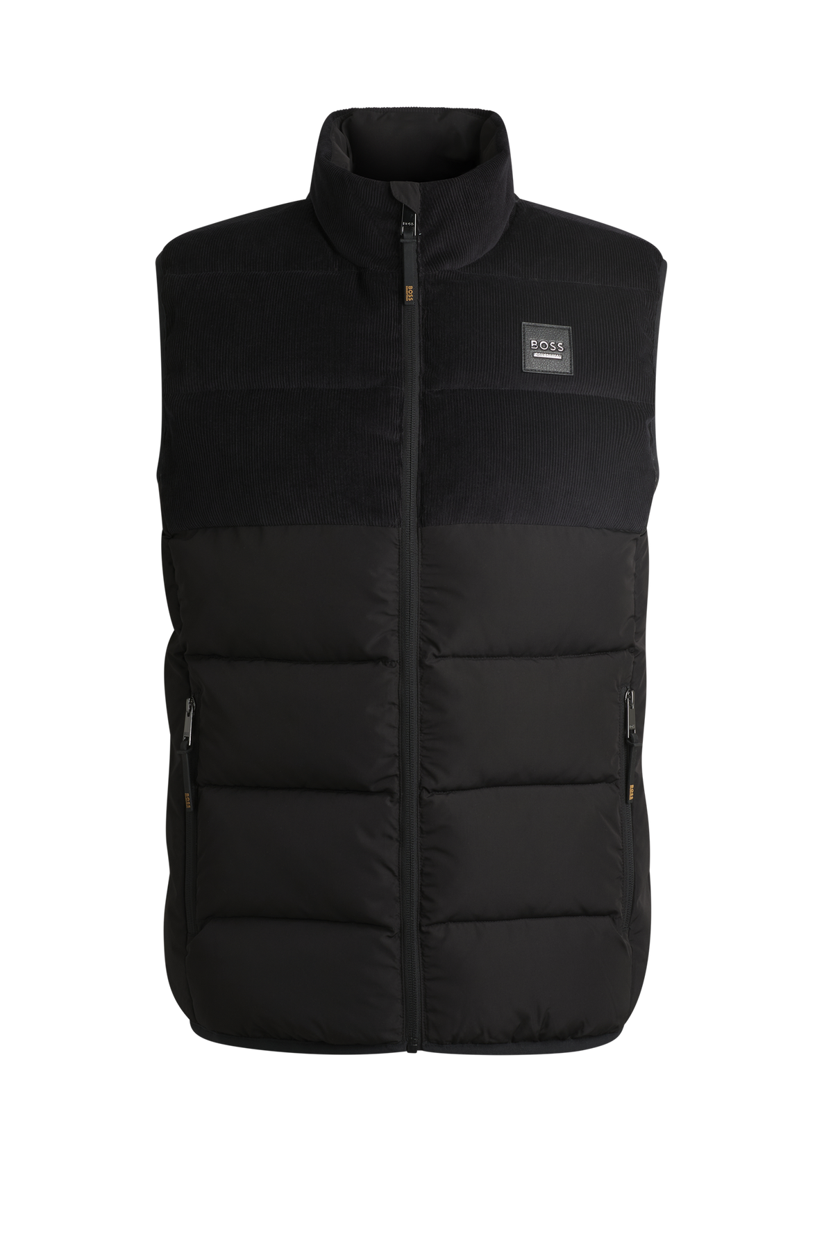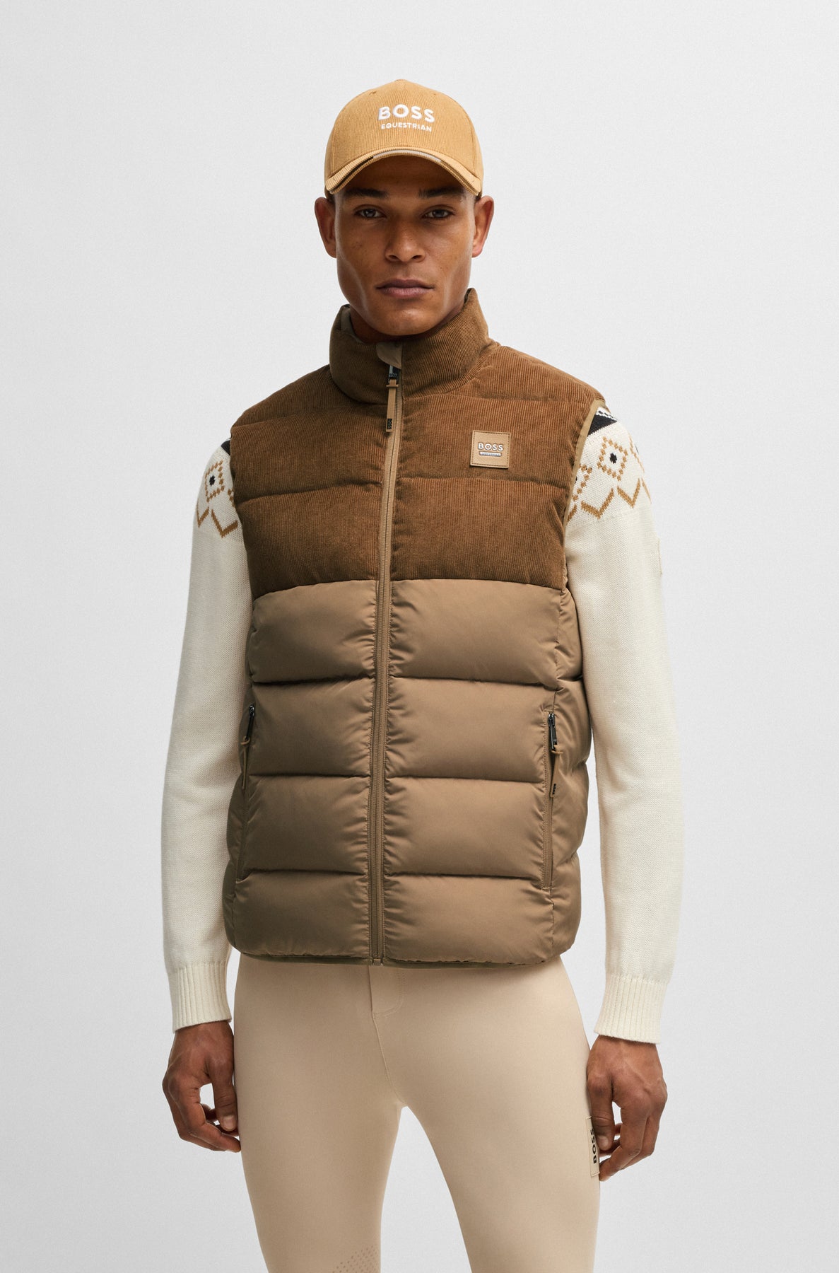 BOSS Equestrian watttierte Weste mit Cord Applikation im oberen Bereich. Die Weste ist wasserdicht und winddicht. Der Einsatz von Cord im Kragen und oberen Bereich der Weste machen Sie zum modischen Hingucker und sind die optimale Wärmeschicht zum Reiten und in der Freizeit.