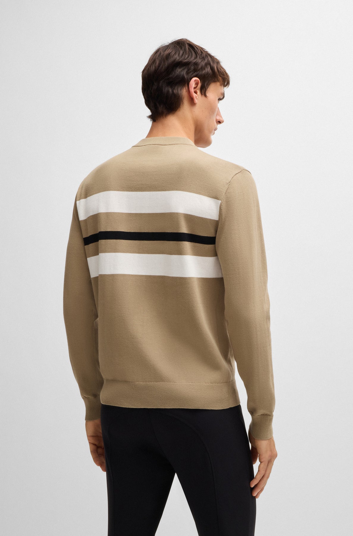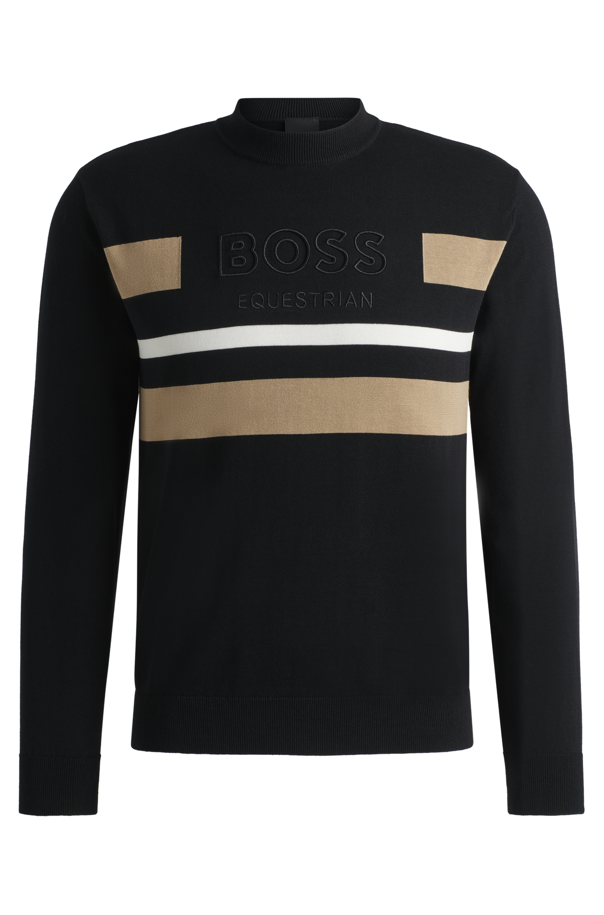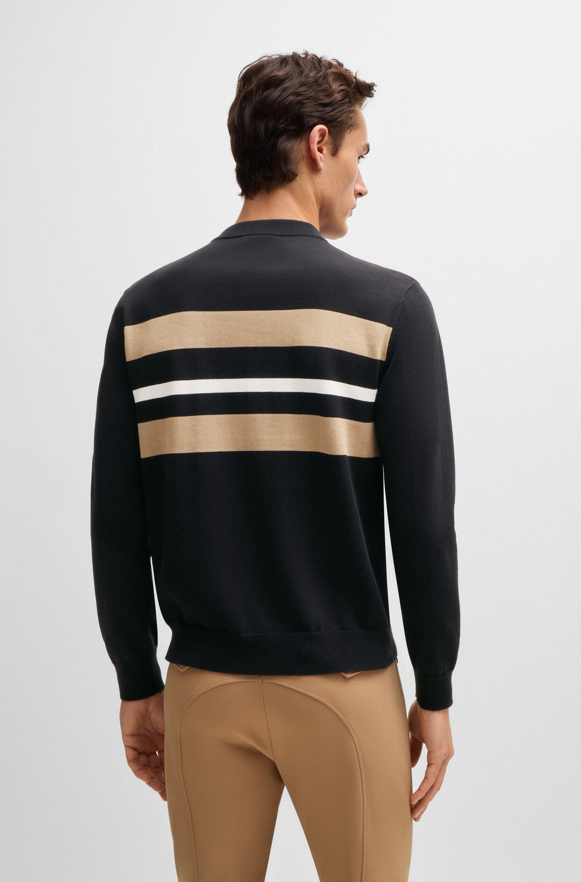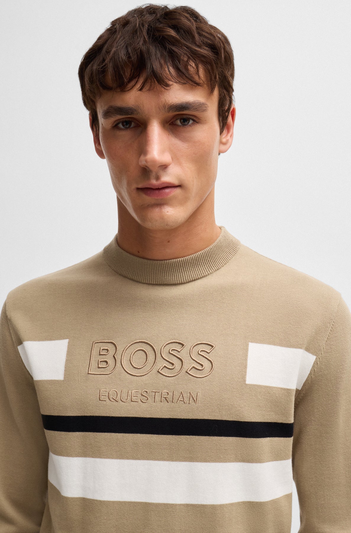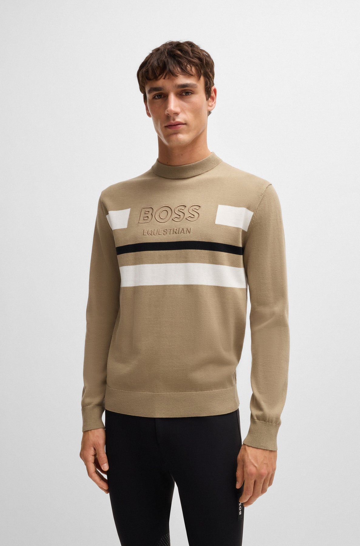 Strickpullover mit Rundhalsausschnitt und Kontraststreifen auf Vorder- und Rückseite. Auf Brusthöhe ist das BOSS Equestrian Logo tonal eingestickt. Der Pullover ist extra fein gestrickt in 14 GG aus gekämmter Baumwolle.