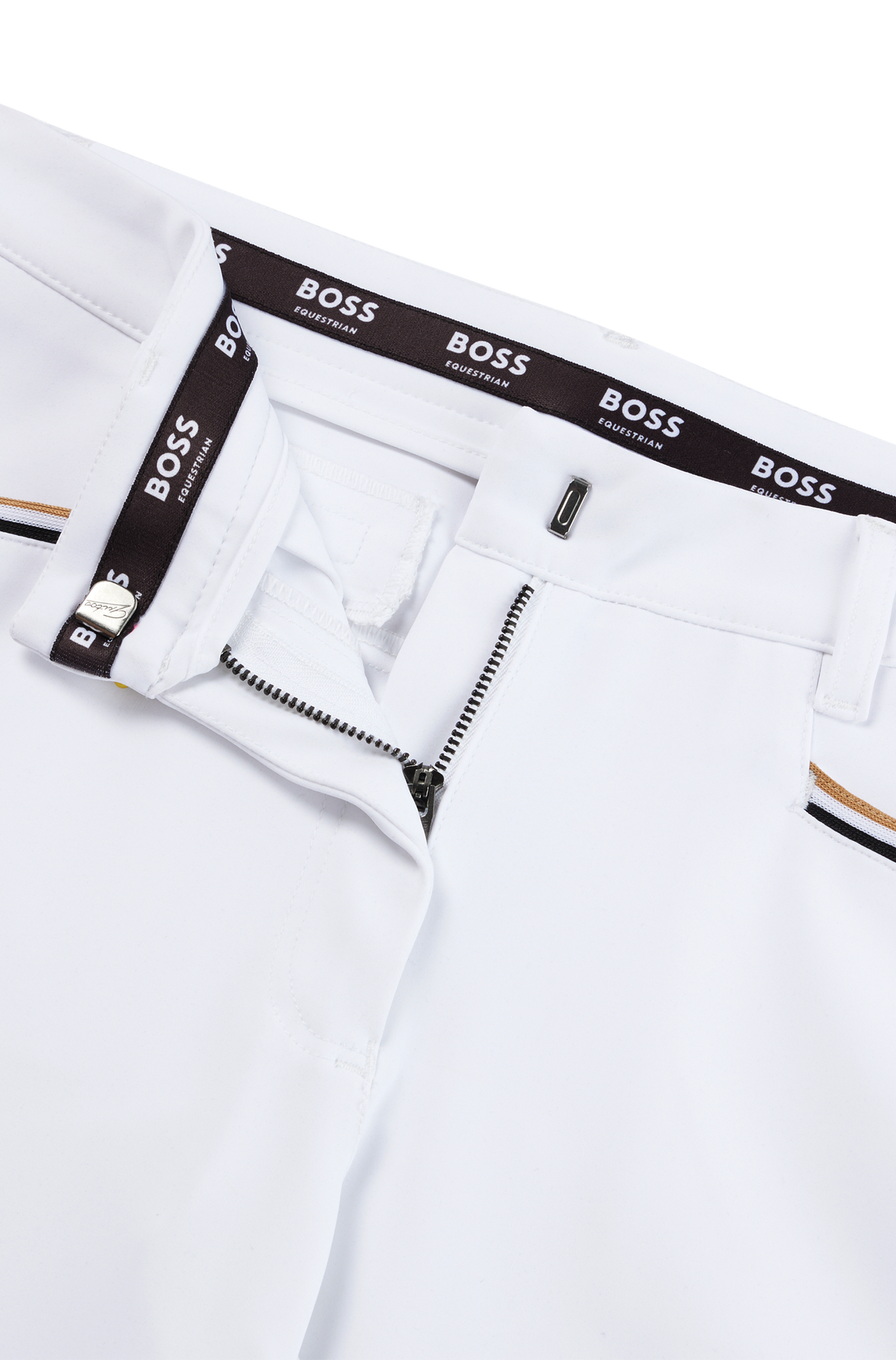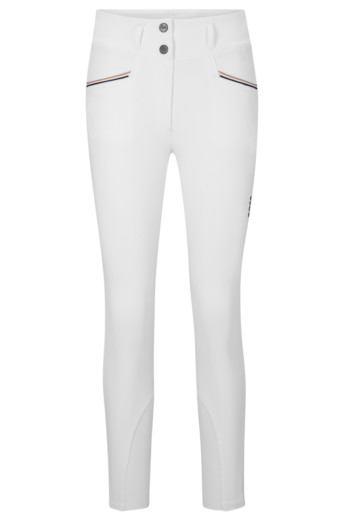 Moderne High-Waist-Reithose in weiss mit BOSS-Logo-Patch auf dem linken Bein und praktischer Smartphone Tasche. Beste Bewegungsfreiheit bei optimaler Passform und weichen, ergonomischen Kniebesatz.