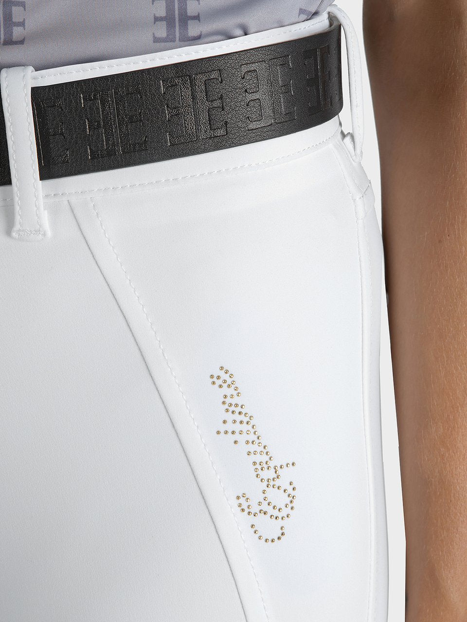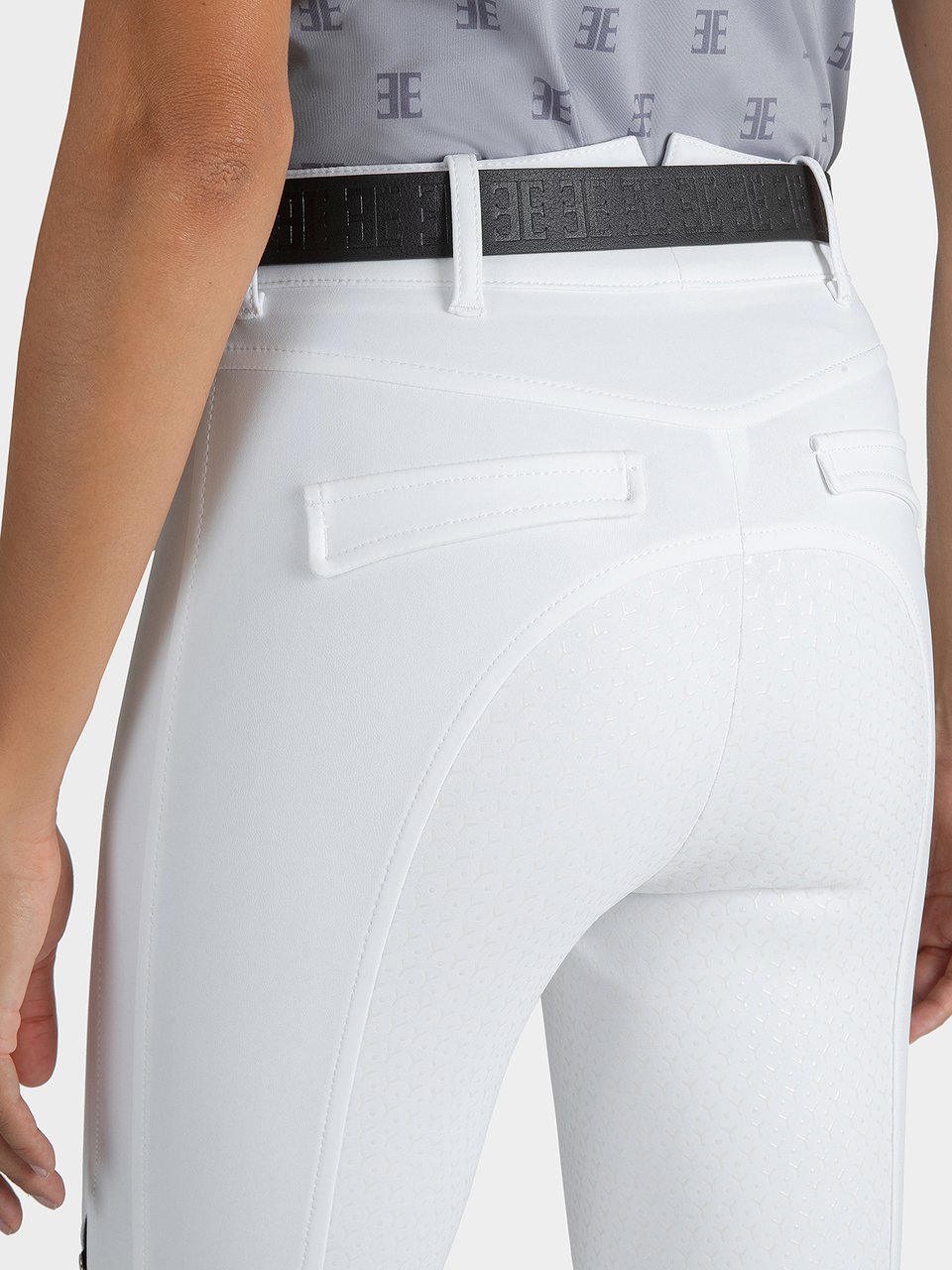 Elastische und komfortable Damenreithose mit Full Grip-System und hohem Bund. Aus gebondetem, atmungsaktivem, für jede Jahreszeit geeignetem B-Move-Gewebe. Equiline-Logo aus Mikronieten auf der linken Vordertasche. Maximale Bewegungsfreiheit und UPF 50+ Sonnenschutz. Der Stretchverschluss unten am Bein sorgt für perfekte Passform.