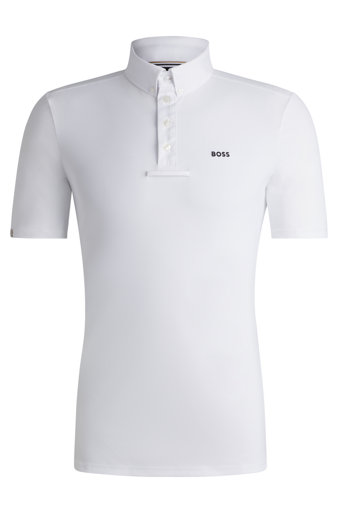 Turniershirt mit halbem Ärmel und halber Knopfleiste vorne mit Signature Stripe Zierleiste. Auf der Brust befinet sich ein BOSS Logo als Lederimitat-Patch. Die Power-Sport-Qualität ist in Piqué-Optik und hat dadurch eine neue Struktur.