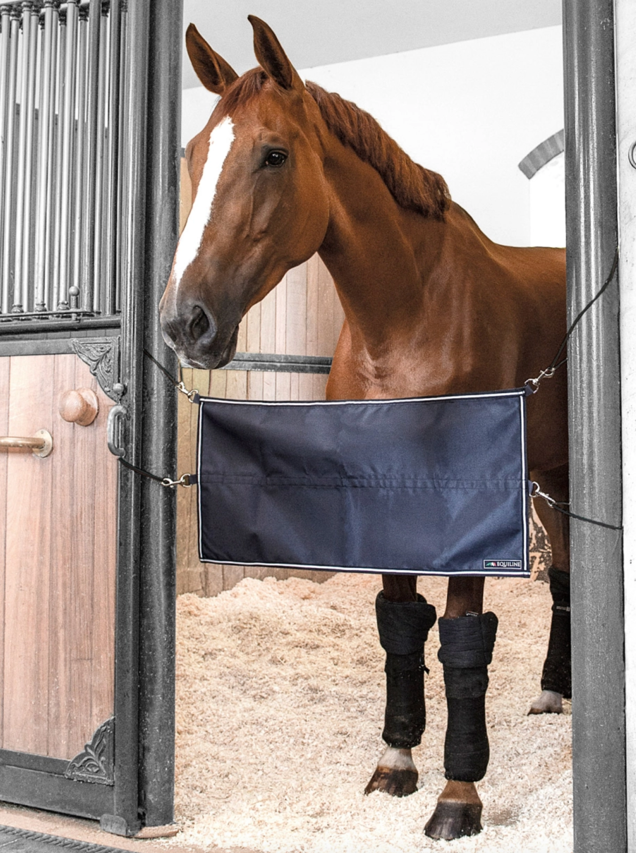 Der Equiline Boxentürverschluss Stable Guard ist aus wasserabweisendem abwaschbarem Polyester gefertigt, welcher mit Haken verstellt werden kann. Der Stable Guard ist sehr praktisch, da er einfach in die Türöffnung mit vier Karabinerhaken eingehängt wird. Besonders im Sommer erhalten Sie so eine bessere Luftzirkulation in der Box. Ihr Pferd hat somit Ruhe in der Box und hat trotzdem einen guten Kontakt zur Außenwelt.