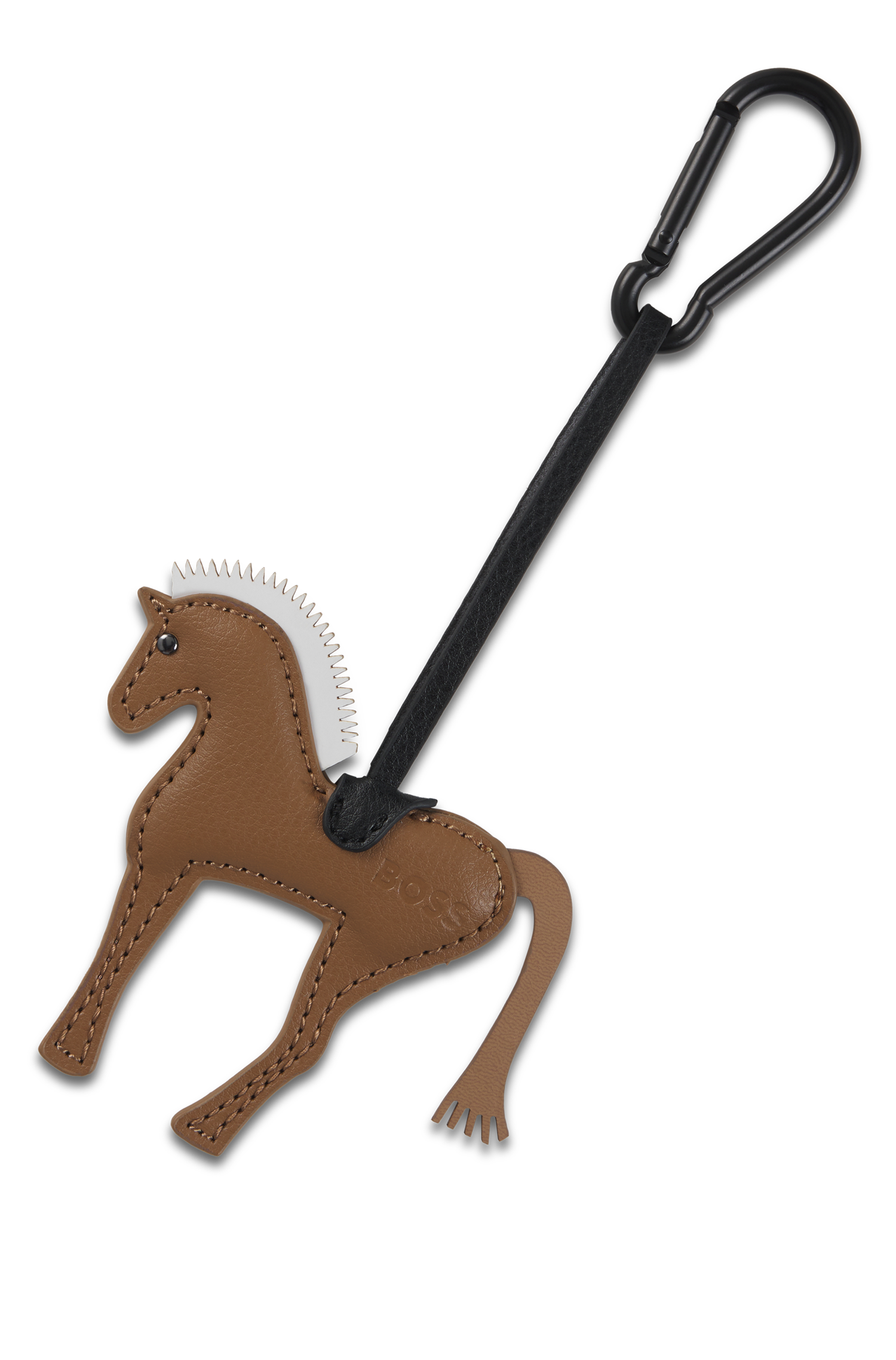 BOSS Pferdeanhänger aus Lederimitat mit Sattel und BOSS Logo. Karabiner vorhanden.