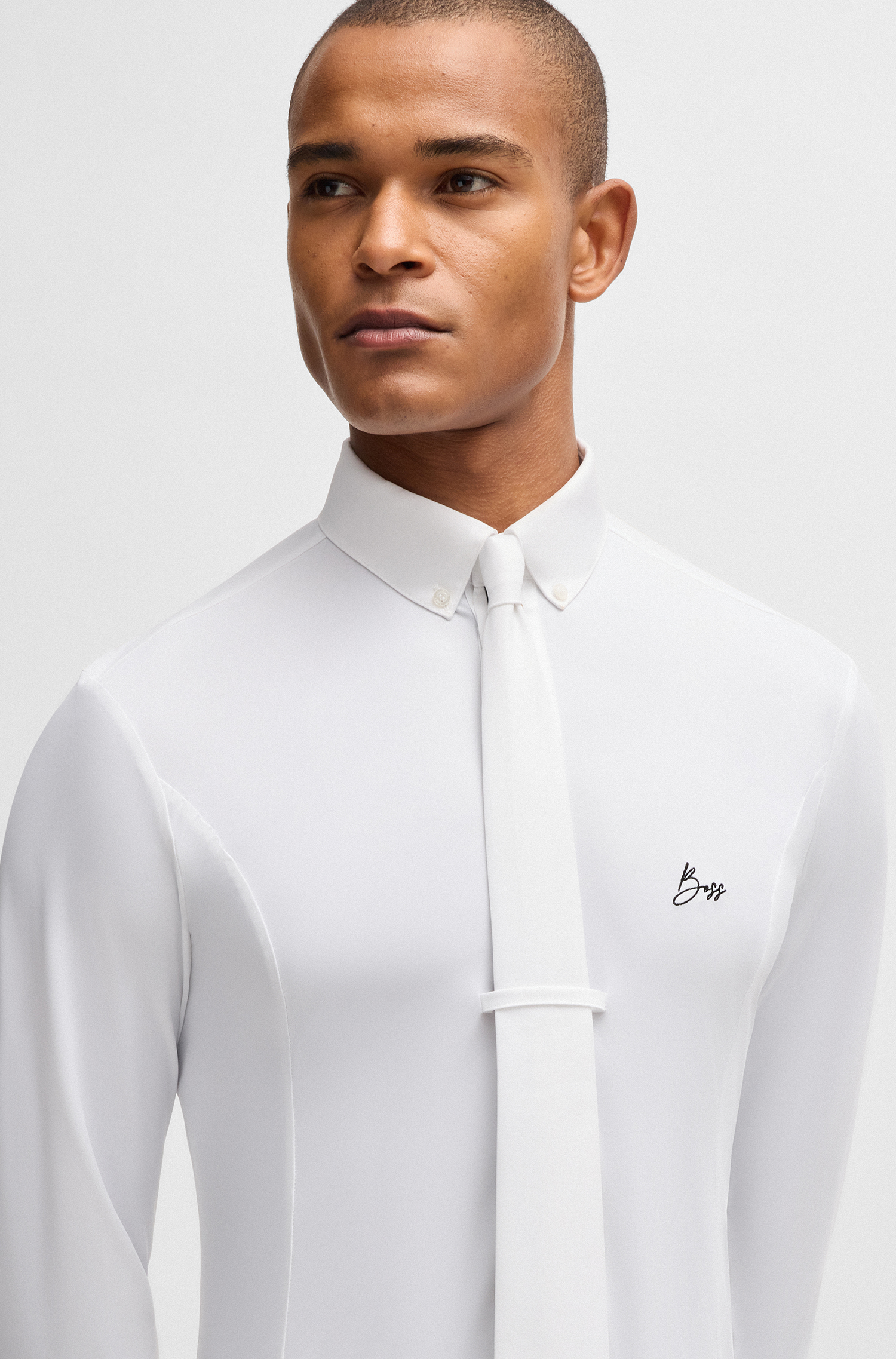 Hybrides BOSS Turnierhemd, das besonders hohen Tragekomfort verspricht. Das schmal geschnittene Hemd mit Button-Down-Kragen ist aus einem Baumwoll-Mix gefertigt und bietet dank Power-Stretch-Einsätzen an den Seiten optimale Bewegungsfreiheit. Die Untere Knopfleiste ist nur als Blende gearbeitet für schnelles an und ausziehen. Der Krawattenriegel ist schon intergiert für den optimalen Halt beim Reiten. Das Logo ist in handschrift gestickt auf der linken Brust. Das Material ist fusselfrei, schnelltrocknend, atmungsaktiv mit Lichtprotektion.